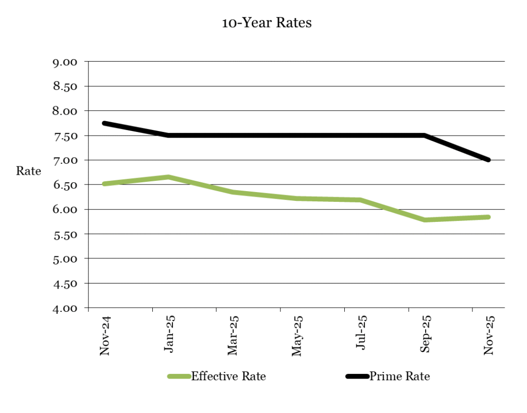 Rates are tied to the bonds that are sold to investors and the interest rates are typically reflective of the 10-year U.S. Treasury bond rate, which is a long-term, fixed-rate asset.